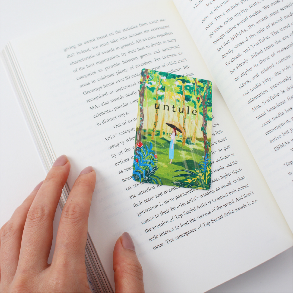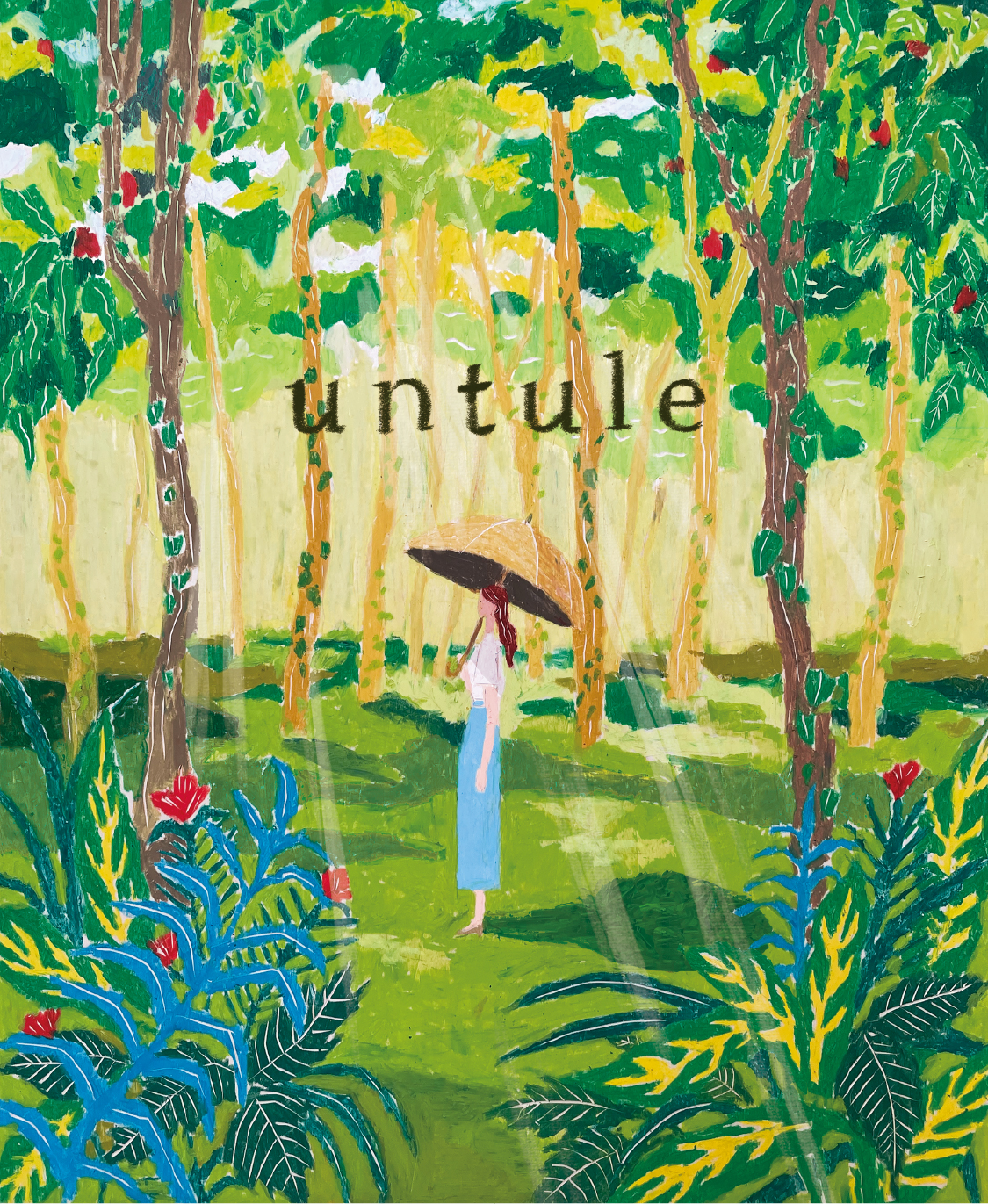 コンセプトやブランドのコレクションをみて、緑色と自然が画面に溢れるようにしたいと思ったので、日差しの入る森の中でuntuleの日傘を使用しているというシーンを一番感じられる構図にしようと思って描き進めました。