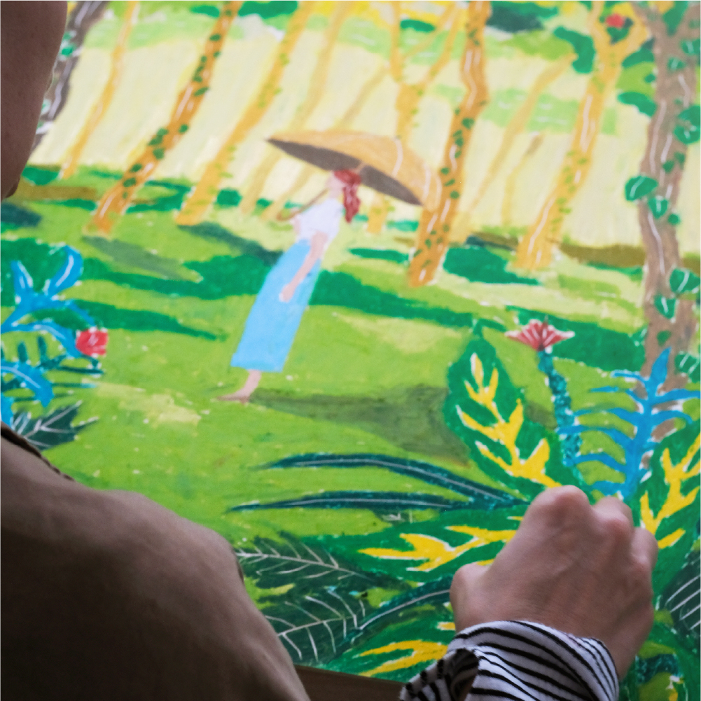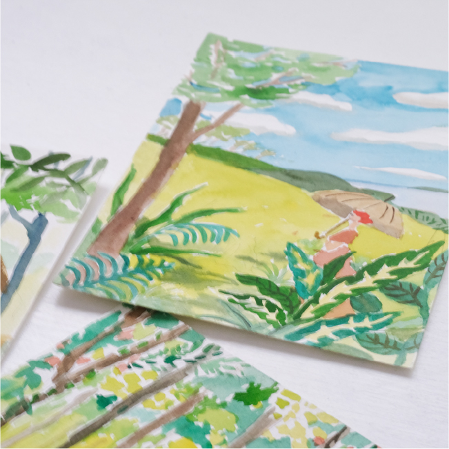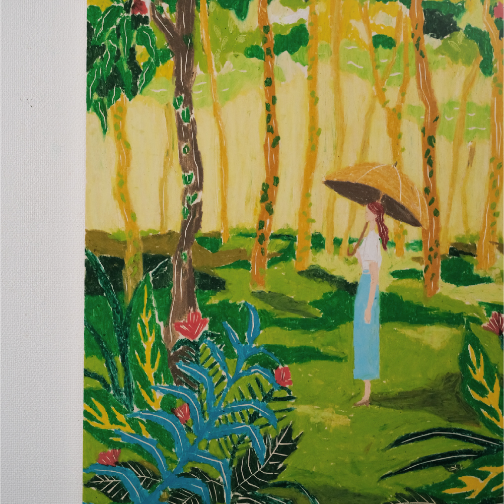 こだわった点は【光の表現】です。私の絵はあまり立体的だったり写実的なものではないので、どういう風に描けば、葉っぱから落ちてくる木漏れ日だったり、見上げた木々の間から見える明るい空や、untuleの日傘を使ったときの地面に落ちる影が見た人に伝わるかなと考えて、色合いだとか色の差を工夫しながら描きました。