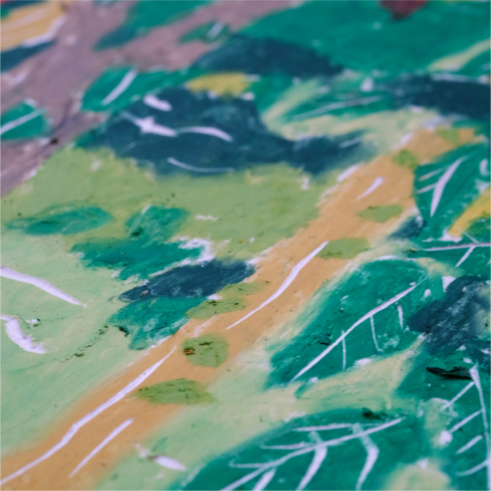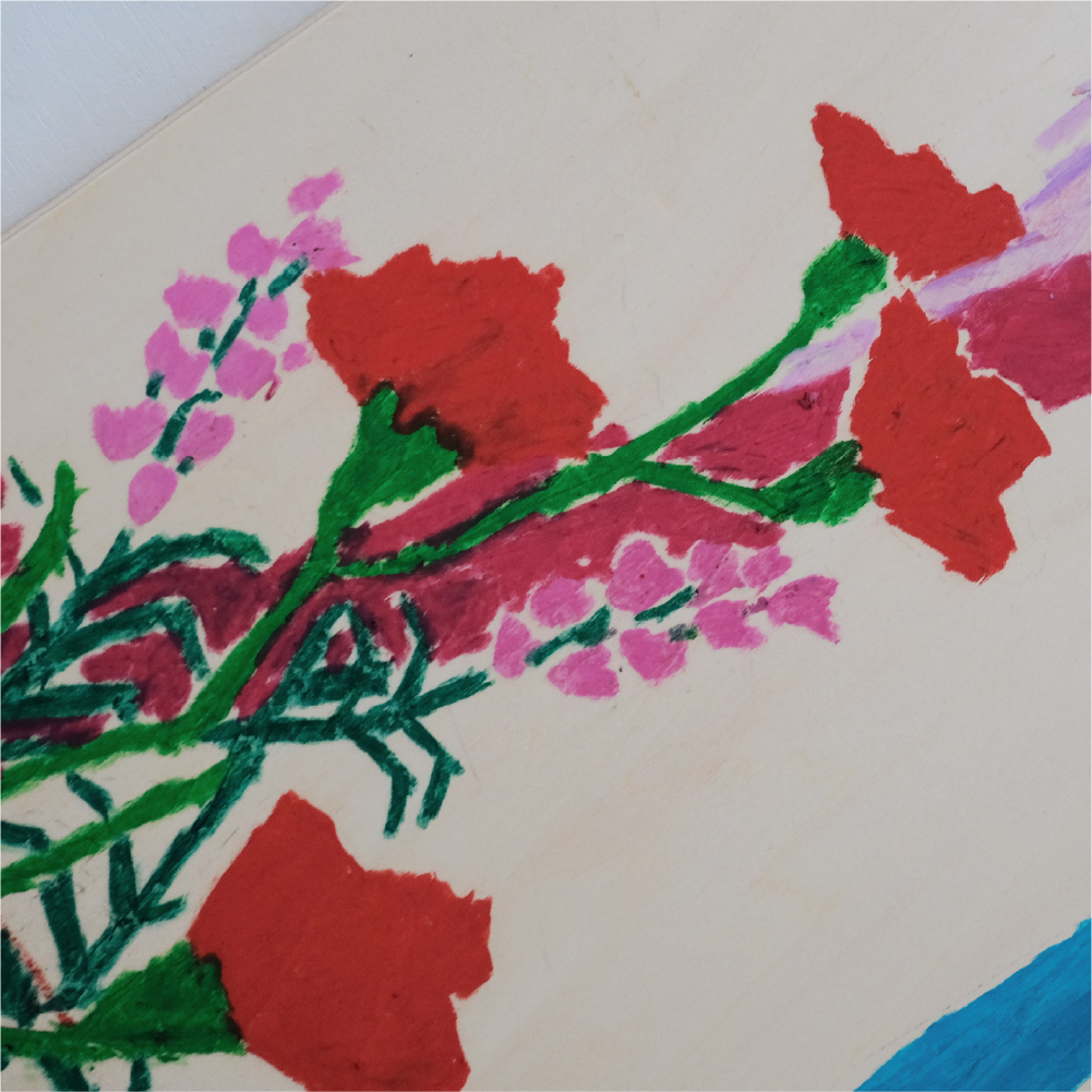 オイルパステルで厚く塗るとちょっと油絵っぽい感じになるんです。この柄は彫刻刀で削っているんですが、楽しいんですよ。童心にかえったような感じというか。