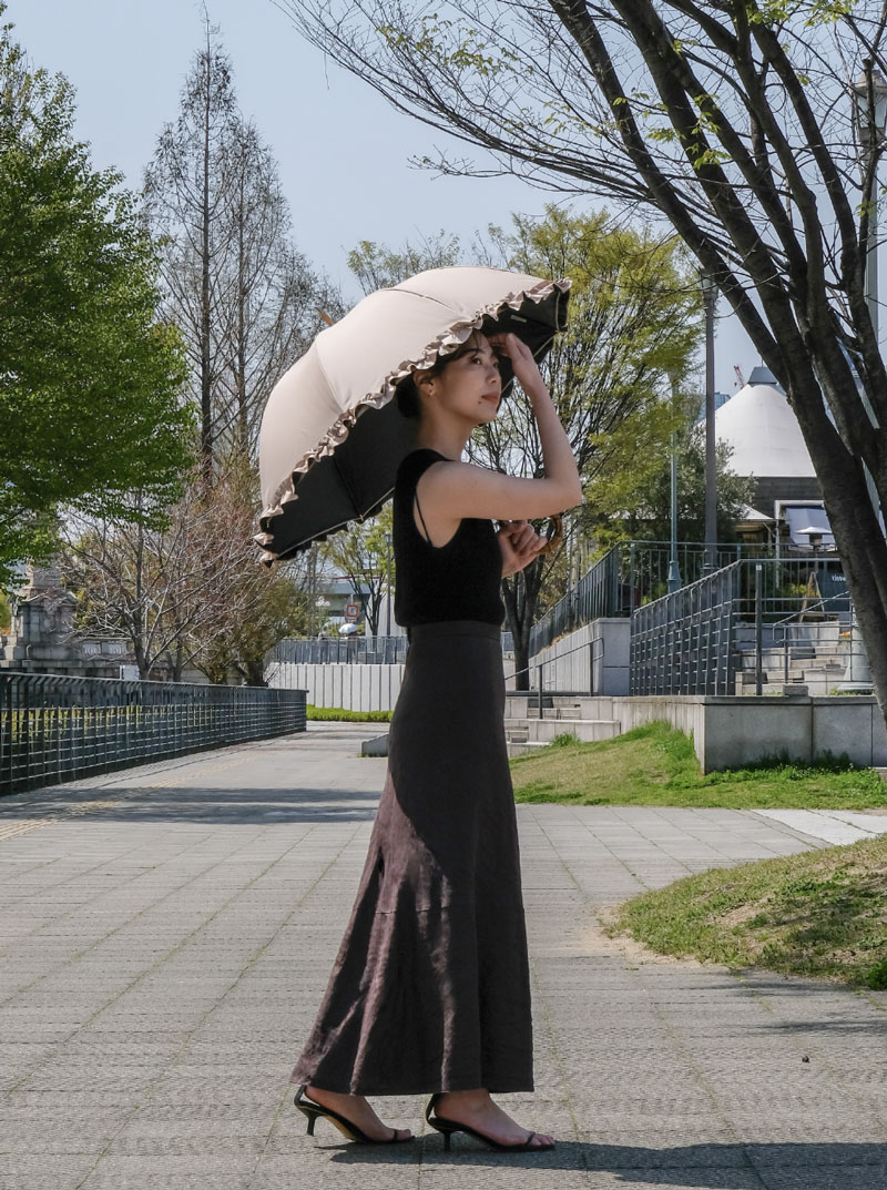 同じ直径のフラットタイプの傘と比べても、横からの紫外線をより効果的に遮ることができます。歩いている時にも、少し傾けるだけで紫外線から守ってくれます。